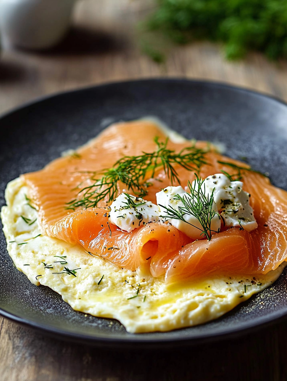4. Schmelzender Käse: Falls Sie zusätzlich Käse verwenden möchten, streuen Sie ihn direkt nach dem Lachs über das Omelette. Die Restwärme lässt ihn sanft schmelzen.